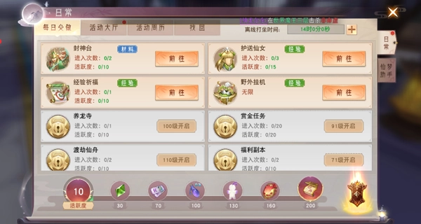 1、进入游戏后,跟着主线任务推进即可,阴阳双剑的剧情设计十分出色,在优美的场景与背景音乐中,随着主线任务的完成,很快就能达到43级。当43级主线任务暂时结束时,大家可以通过完成日常任务来提升等级。每日最多可完成20次日常任务,每次任务都能获得大量经验,这是新手玩家们一定要做的重要任务。