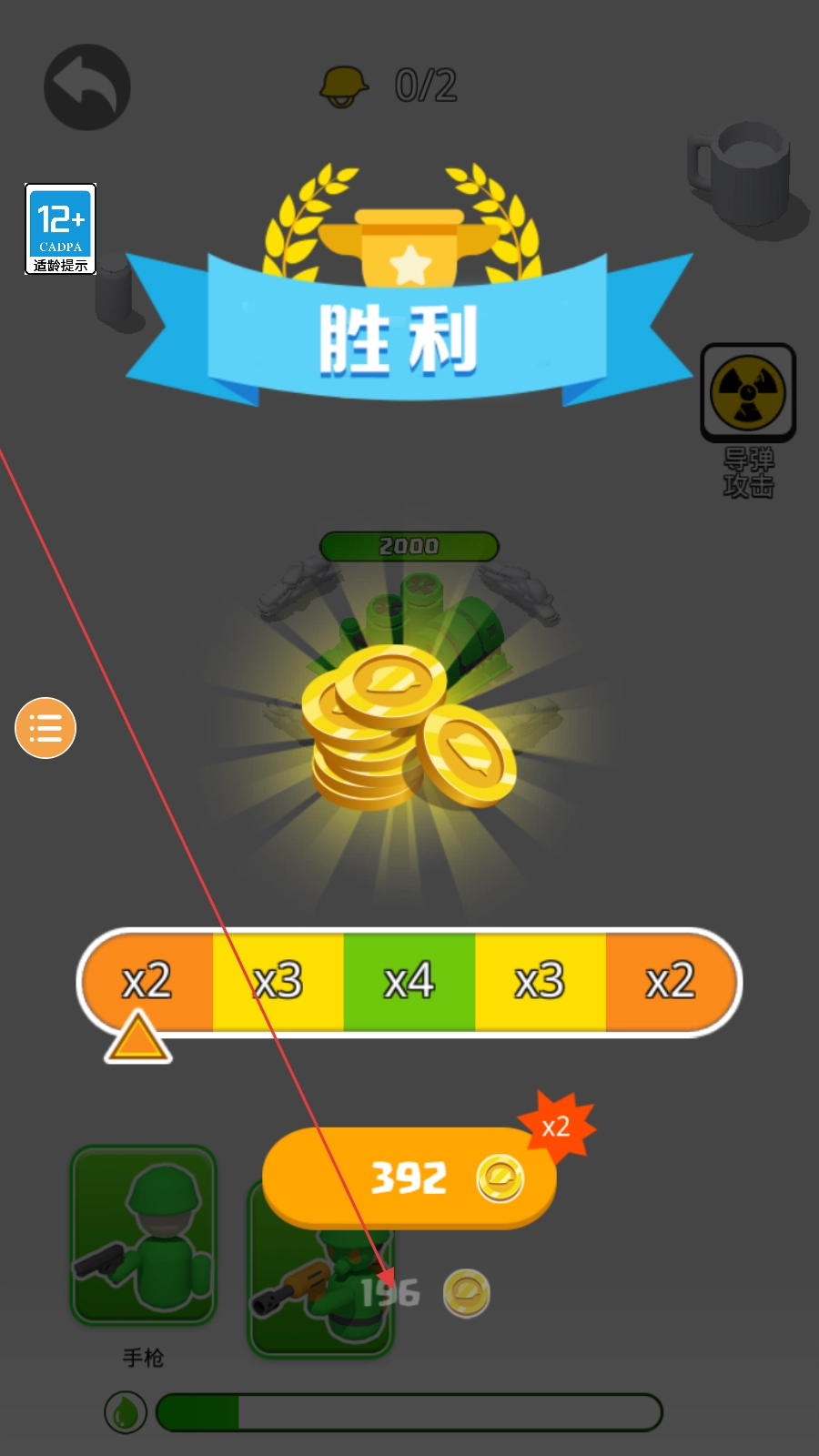 4、成功击退敌人,取得胜利后,点击【196】即可领取金币奖励并解锁新关卡。