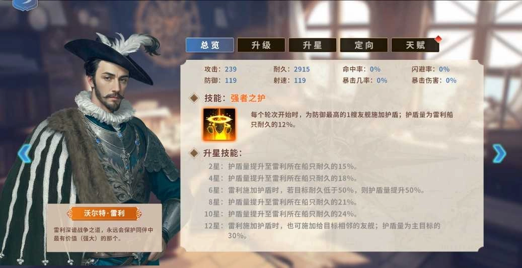 注意要点:【雷利】会给防御值最高的船只加上护盾,【克伦威尔】则是对相邻左右两边的单位进行保护,所以在排兵布阵的时候,要把主坦或者主攻舰安排在这两位船长的旁边,这样才能让收益达到最大。