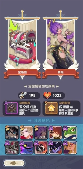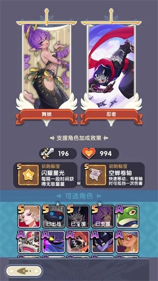2、接下来要特别推荐舞娘或忍者作为支援角色。大家都清楚,支援角色的核心作用是携带自身初始秘宝参与战斗,舞娘的“闪耀星光”能够每隔一段时间触发无敌状态,借此周期性地快速清理怪物、拾取道具,实用性很强。忍者的初始秘宝“空蝉卷轴”则能抵御伤害,有效提高战斗中的容错率。要是这两个角色能同时助战,战斗过程自然会更轻松~
