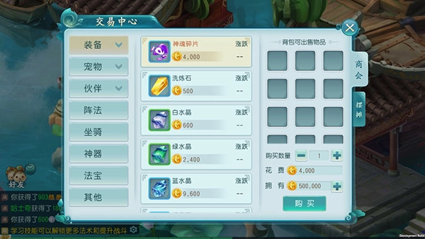 5、游戏内设有自由交易系统,交易中心支持各类装备、宠物、伙伴、阵法等物品的购买与出售。