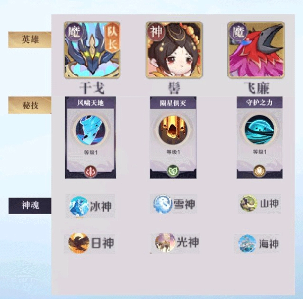 1. 昆仑登仙:选择1名登场英雄和2名候补英雄与敌人单挑。当前一个英雄阵亡时,后一个候补英雄会自动上场继续作战,直到取得胜利或全部英雄阵亡。