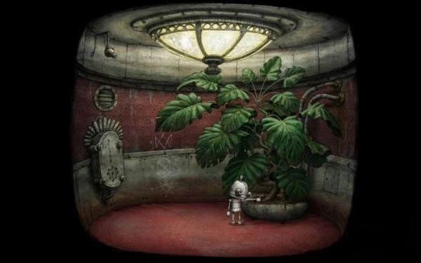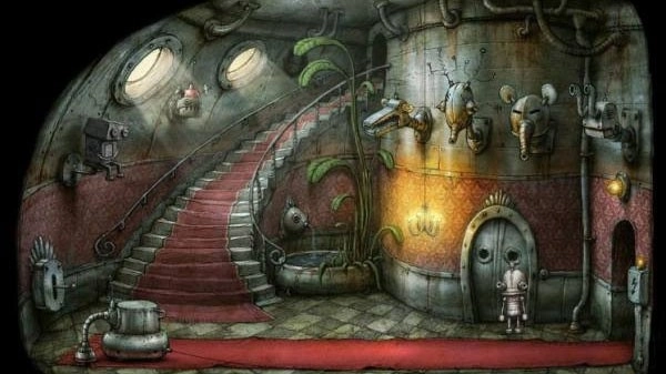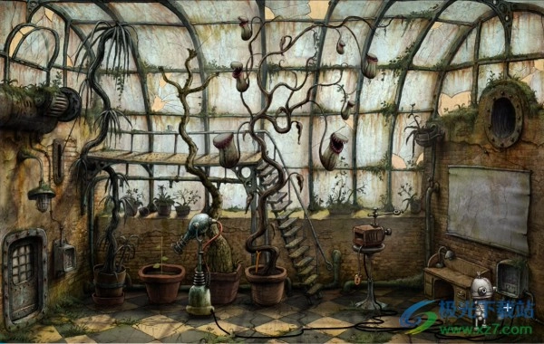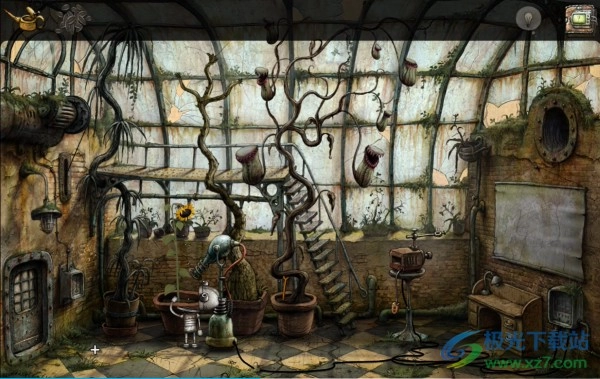 1、刚一出来,就发现一个胖子机器人来偷吃碳,吃完了一车就从一个窗口走了。我在这关卡了半个小时才明白意思,先到画面右方下面锁着的门旁边拿到勾在墙上的钥匙。