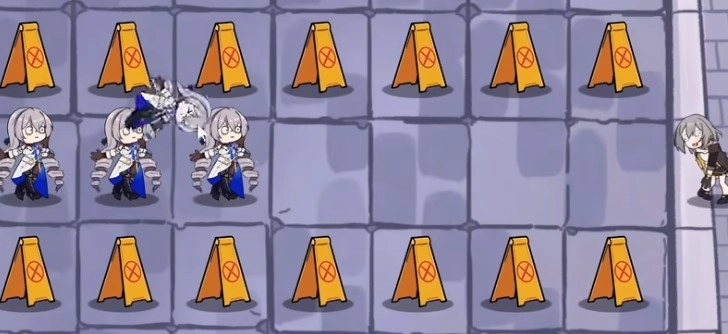 第六列的牌子位置放置两个帕姆,开局先观察开拓者出现的路径,那条路就保持空位;接着在从左往右数的第一列牌子处放置鸭鸭,就放在有僵尸的那一列。通常如果开拓者和最近的植物之间间隔三四格距离,就不需要再放第二个鸭鸭。等开局的开拓者被解决后,就可以把帕姆放置上去了。