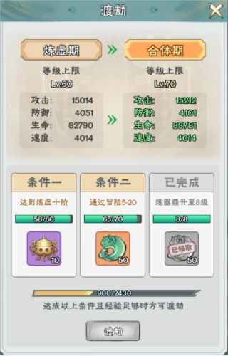 每当道友完成渡劫任务并获得足够的经验即可进行渡劫,提高角色属性,还会改变角色外貌;