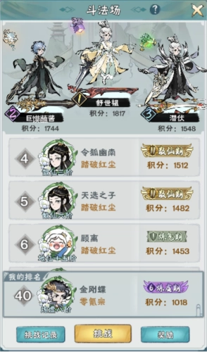 斗法场中消耗挑战券可以挑战其他道友,挑战胜利会获得一定积分以及奖励。积分越多排名越高结算奖励越丰厚。