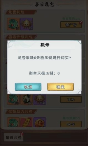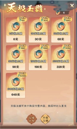 例如购买6元礼包,只需花费6个天极玉髓。