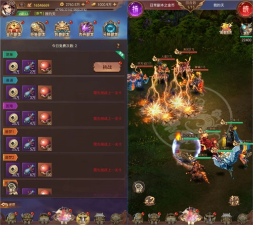 日常副本是游戏内获得材料的重要途径,也是玩家每天必须完成的任务。副本类型分为:金币、经验、异兽、内丹、元神副本5种,玩家需通过上一副本难度级别才能激活下一难度级别的副本,副本难度从简单到地狱。挑战不同类型副本可获得对应不同的材料资源奖励