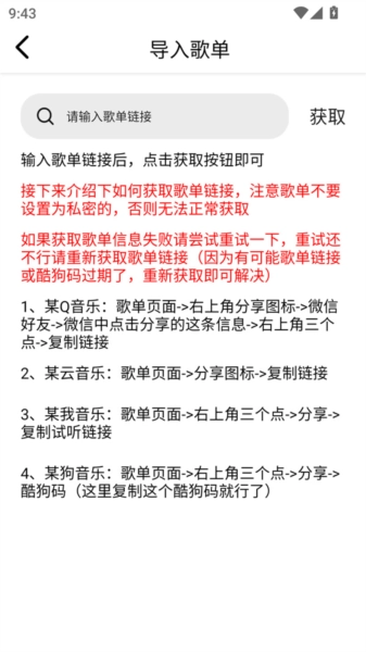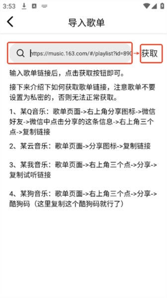 2.将第三方平台的歌单链接粘贴到搜索框后点击“获取”