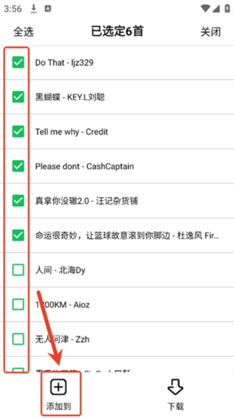4.勾选感兴趣的歌曲后点击“添加到”