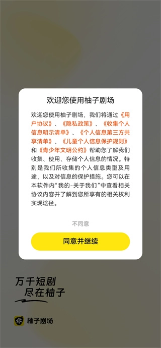 1. 点开柚子剧场App,在阅读完用户隐私协议后,点击“同意并继续”,就能进入软件。