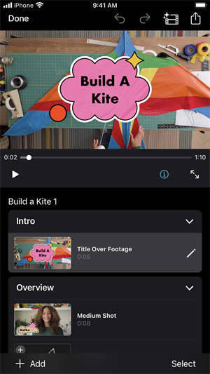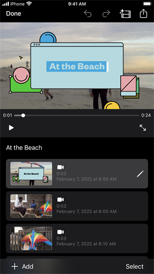 —选择相簿或者一组视频或图像,iMovie 剪辑便会为你创建带字幕、转场和音乐的视频,无需编辑视频