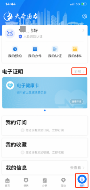 (1)认证登陆“天府通办”APP后,点击“我的”电子证明“全部”进入电子证明页面。