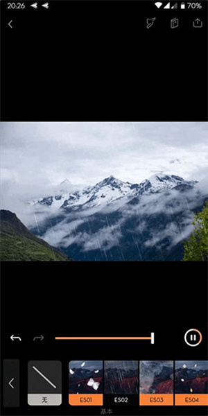 接下来,我们为画面增添几分「山中细雨,润物无声」的意境。具体做法是,在「覆层」里挑选「细雨」特效,然后对效果的强弱进行调节,防止特效过于显著,从而出现喧宾夺主的情况。
