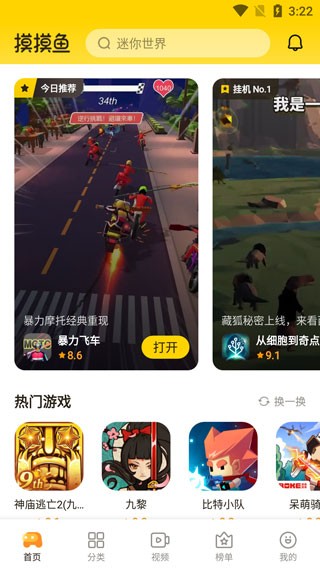1. 在本站下载摸摸鱼,安装到手机并打开。进入首页,你能看到众多好玩的游戏。