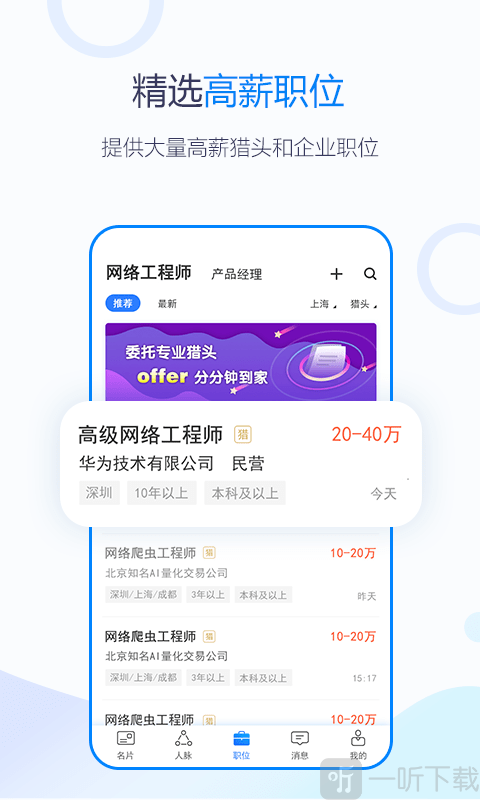 2. 平台拥有大量高薪热门的招聘职位,任您挑选。上传名片照片后,您还能获取高端职场人脉资源。
