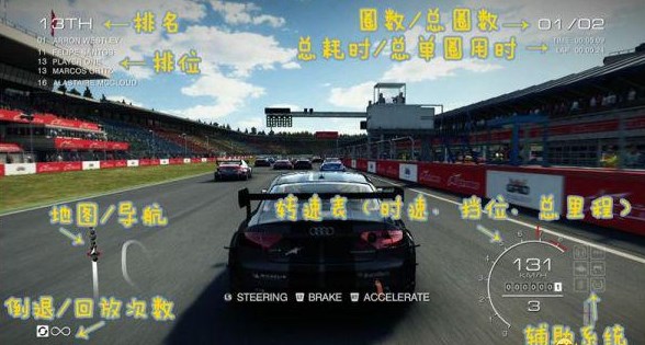 左上角显示为比赛的排名以及车手的位置;右上方为圈数以及比赛用时;左下角为地图;右下方为转速表、时速表。