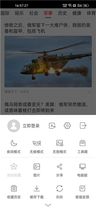 3、功能上有无痕模式、夜间模式、无图模式、工具箱、缓存、添加书签、浏览历史、客服反馈甚至可以切换到电脑版