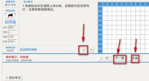 3、答题时,请仔细审题,选定自认为正确的答案后,点击【下一题】接着作答。待所有题目都完成,点击【交卷】按钮。交卷之后,系统将自动统计分数,届时你便能查看自己的考试成绩。