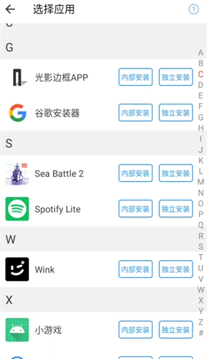 2、点开加号以后会显示你自己手机里的软件,点击字母选择软件制作相应分身。