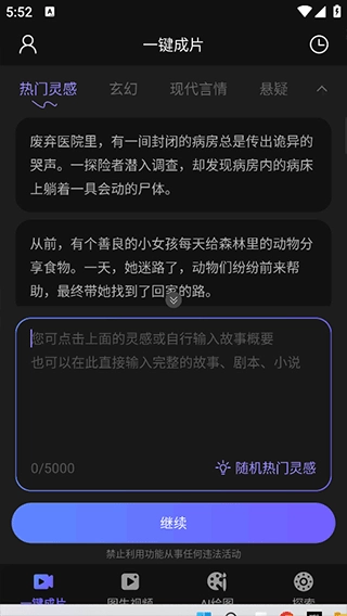只需给出一句话描述,AI视频绘图写作精灵即可迅速创作出完整故事,还能依据故事内容自动生成视频。