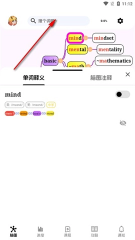 3、成功登录后进入软件首页,页面设有搜词和脑图功能。在搜词输入框中输入需要查询的单词。