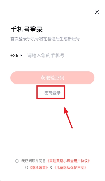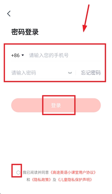 请输入手机号与密码,同时勾选“我已阅读并同意《高途英语小课堂用户协议》《隐私政策》以及《儿童隐私保护声明》”,随后点击“登录”按钮,即可完成操作。