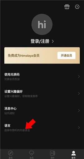 1、从本页面喜马拉雅,跳过登录等步骤后来到下方主界面,点击右下角“账号”进入个人设置界面。