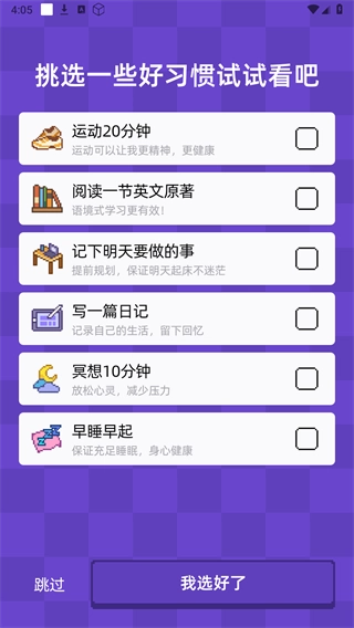 像素习惯,堪称一款极为实用的习惯养成打卡利器。借助打卡,它能记录习惯养成的全过程,助力你提升生活质量与效率。在记录自身习惯与行为之际,你还能畅享乐趣,收获游戏化的成长体验。