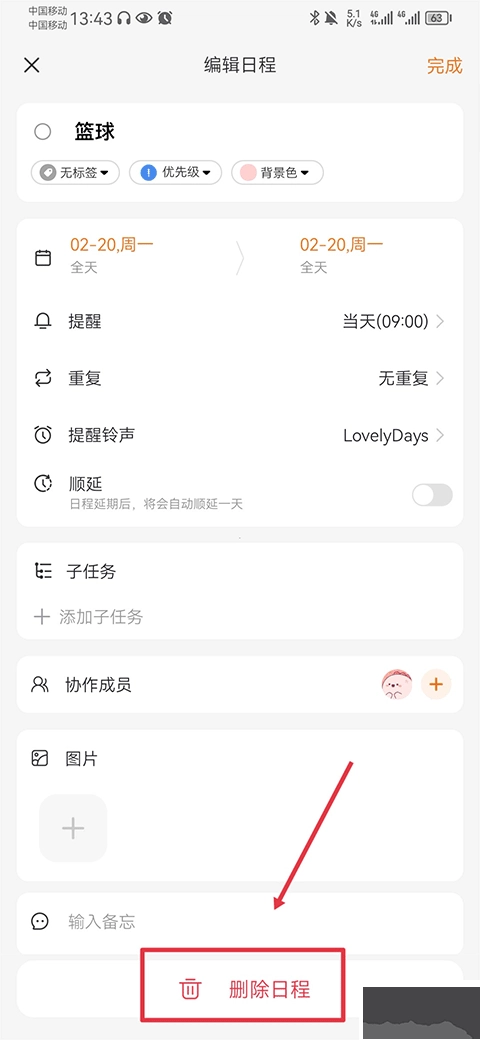 2. 点击后,便能进入编辑日程的界面,接着点击下方的删除日程选项,即可完成删除操作。