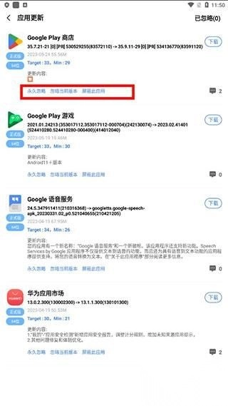 3、当然,您也可以选择忽略您不想更新的应用。