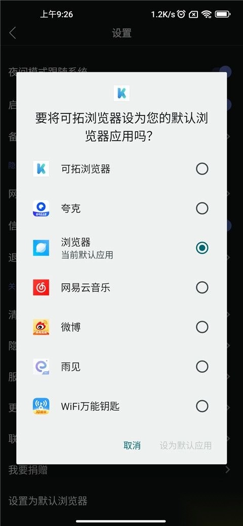 1、于“设置”页面中选取“设置为默认浏览器”。
