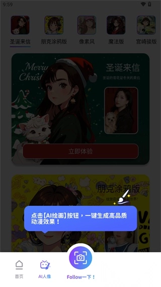 4、在这里有各种模板的人像,包括圣诞版、宫崎骏版、朋克涂鸦版、像素版等,选择自己喜欢的风格,点击立即体验