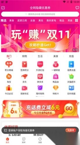 在应用首页,用户能够便捷地搜索并领取各大电商平台(像淘宝、天猫、京东、拼多多之类)的内部优惠券,畅享低至运费价的折扣优惠。