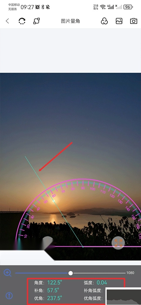 4、若测量的物体较小,你既可以用双指将图片放大,也能够拖动下方的放大条来放大量角器。