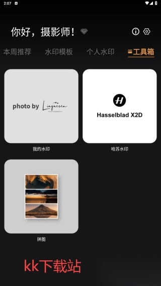 1、在kk站打开应用,在工具箱选项中选择我的水印。