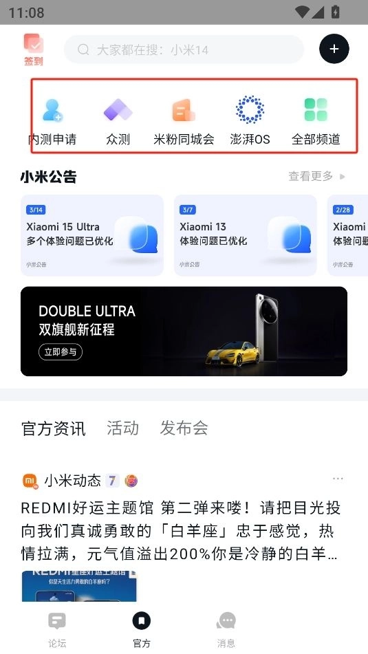 2、在“ ”页面,能够开展“内测申请”等相关操作,并且还能借助“米粉同城会”与其他米粉进行线下互动交流。