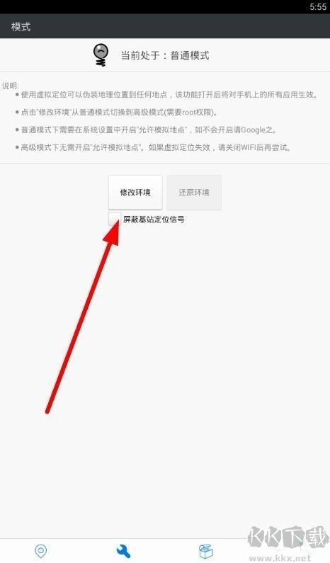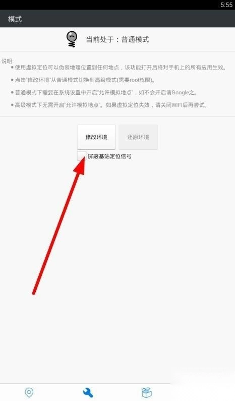 8、如图所示,选中【修改环境】选项,就能从普通模式转换到高级模式。以上便是神行者虚拟位置软件的使用方法。