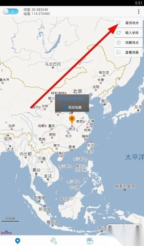 3、进入的小菜单界面涵盖查找地点、输入坐标、收藏地点以及查看收藏等功能,