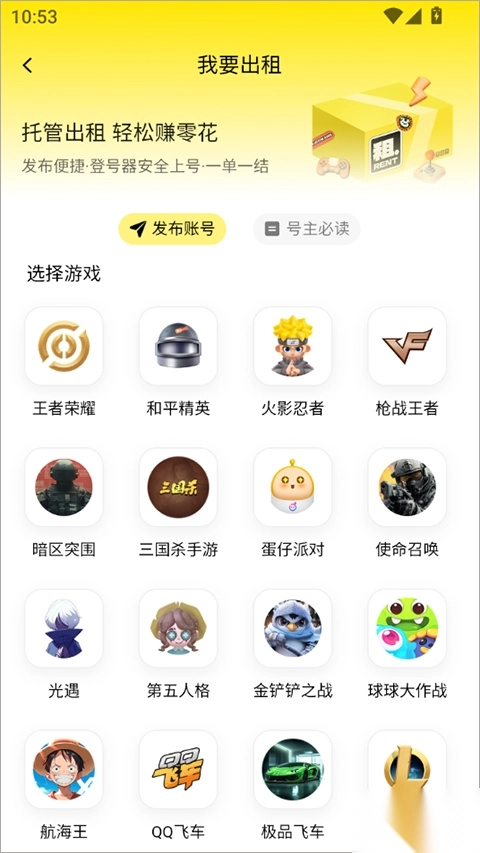 1、在首页、账号页面或我的页面,点击「发布账号」账号,进入「我要出租」页面;