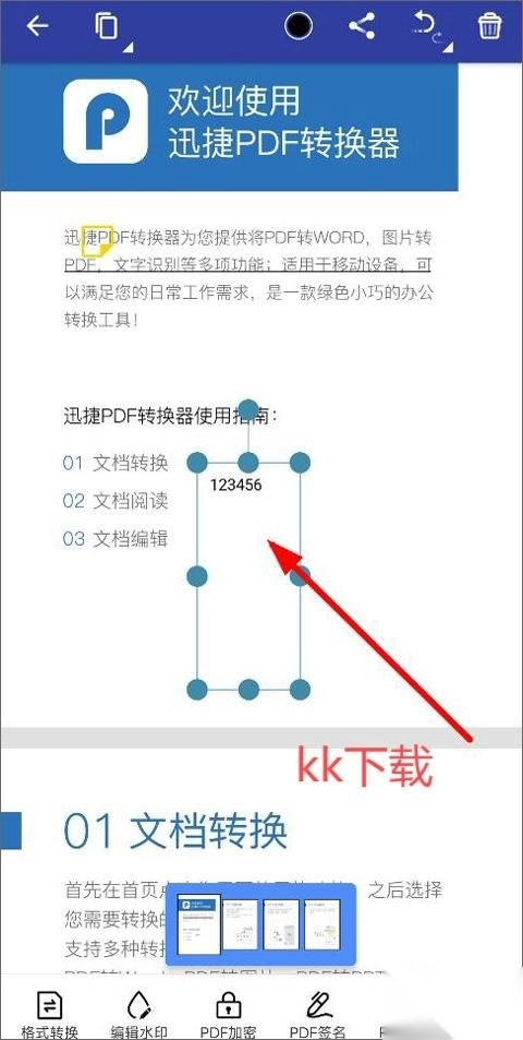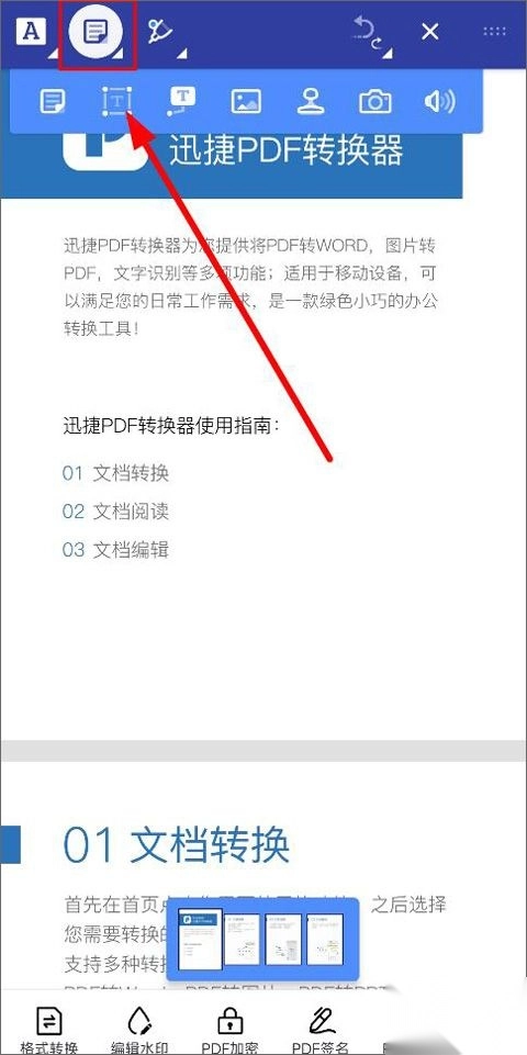 3、文件打开后,会进入编辑页面,此页面具备字体样式设定、格式转换、编辑水印添加,以及PDF加密、签名、压缩等功能。长按并点击左上角中间的图标,就能切换到文字编辑模式。