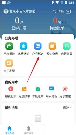 1、首先在本站完成北京自来水相关操作,完成之后,进入软件,点击户号绑定。
