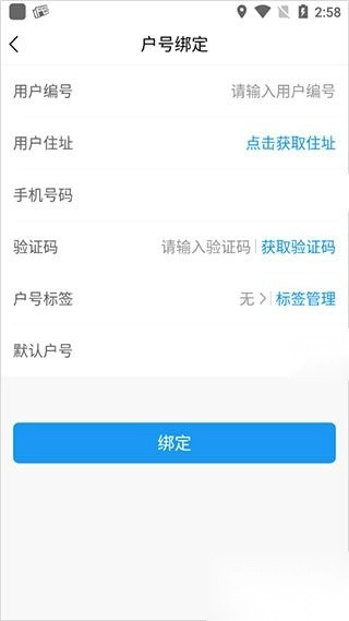 2. 依据自家户号信息完成填写,填写完毕后,点击绑定。