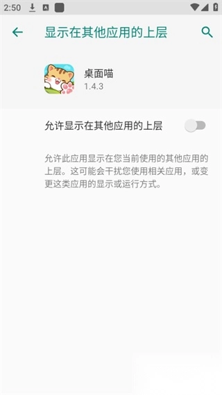 5、点击进入下一个页面,就能跳转至设置界面,然后开启“允许显示在其他应用的上层”选项。