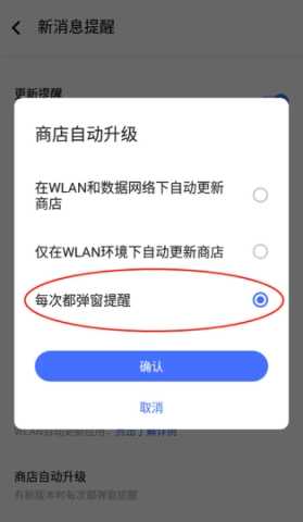 最后确认你选择的是【每次都弹窗提醒】选项,这样就能自动及时更新啦!