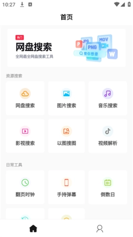1、打开软件,首页能看到众多不同类型的工具,点击需要的工具即可使用,以网盘搜索为例。