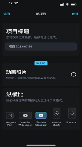 4、在此处能够进行项目标题的设置、动画照片的设置以及格式的选择,全部操作完成后,点击“创建”即可。