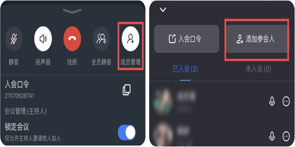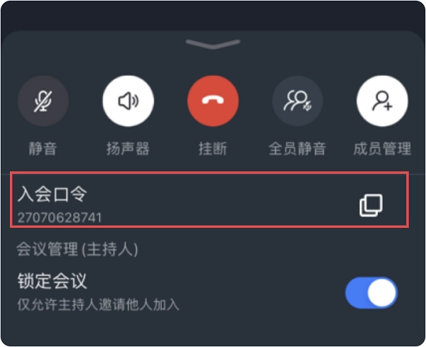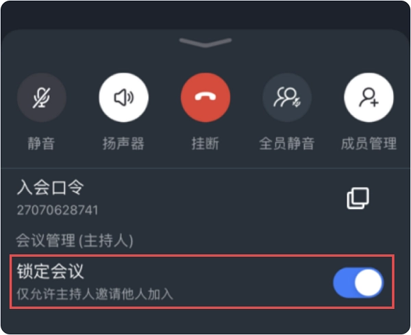 视频发起人(主持人)可设置“锁定会议”权限,来决定是否允许其他参与者邀请他人加入该会议。