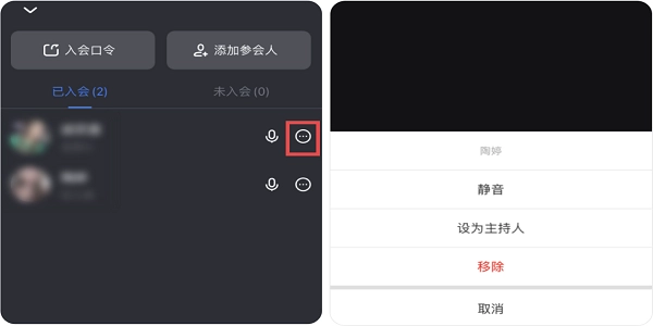在“成员管理”—选择参会人头像右侧“…”可设置该参会人“静音、设为支持人、移除”。