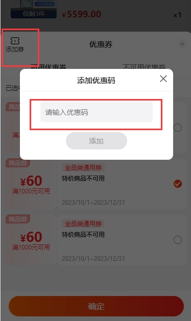 第一步:在下单购买适用于优惠券的商品后,选择优惠券,下方有“输入优惠码”入口